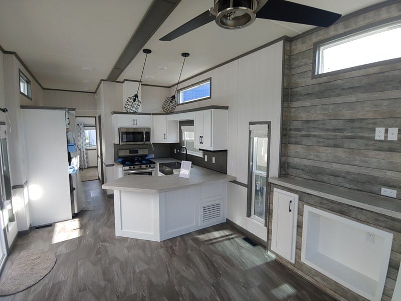 This photo of the Woodland Park Timber Ridge Kennedy park model home shows off a feature that makes cleaning easy: