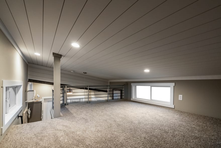 This is another loft use where we recommend perhaps going with a wall instead of a railing. This will help make your tiny house appear more tidy by keeping piles of boxes and other items in storage out of view from below.