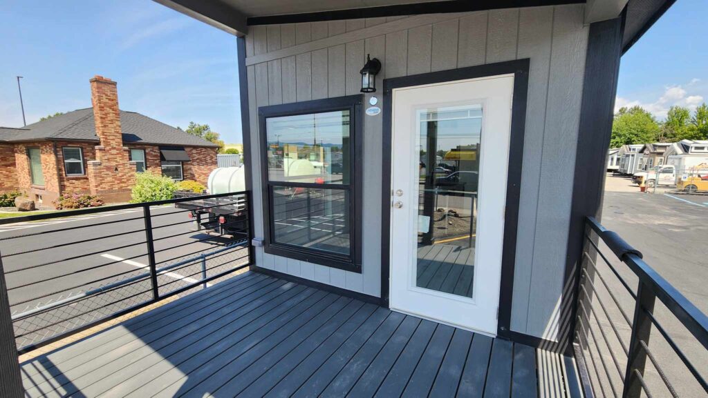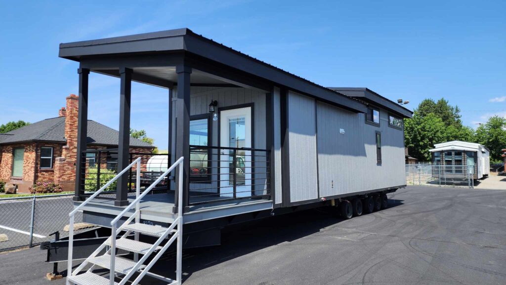This particular model features an eye-catching color scheme: gray siding with black trim and posts, along with black windows. Of course, when you buy a home from Park Model Homes, you can pick any colors you want.