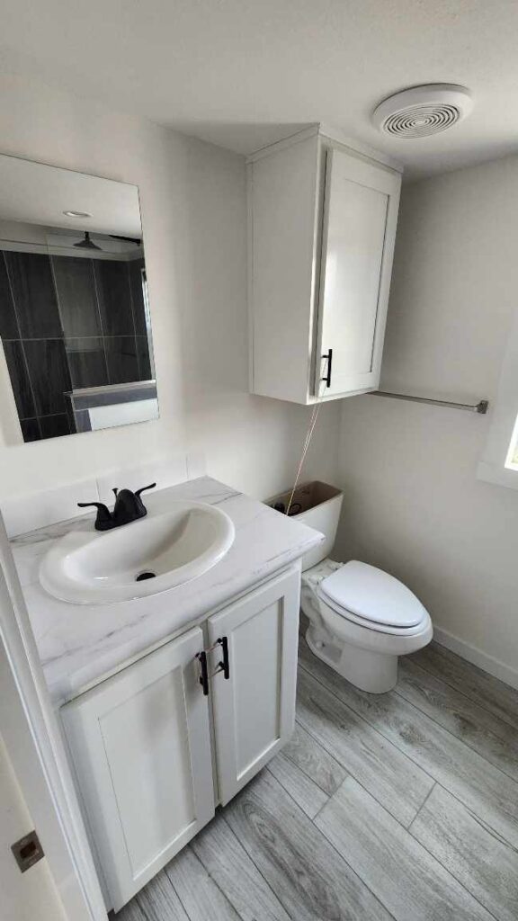Here is the bathroom, one of the most exciting rooms in the house. While you cannot see it in this photo, there is a window right above the toilet that you can open, which is awesome for ventilating this space and preventing mildew. The most impressive part of the bathroom, however, is below.