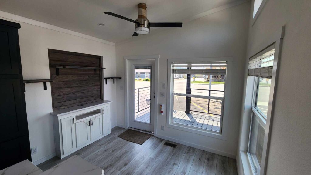 The black metal roof you see here is a brand new color option. As you can see, it is a mono-slope design, giving the house a sleek, modern profile and shedding rain and snow with ease. That is a big deal with a park model home, as it prevents pooling and leaking on the roof. Let’s head inside.