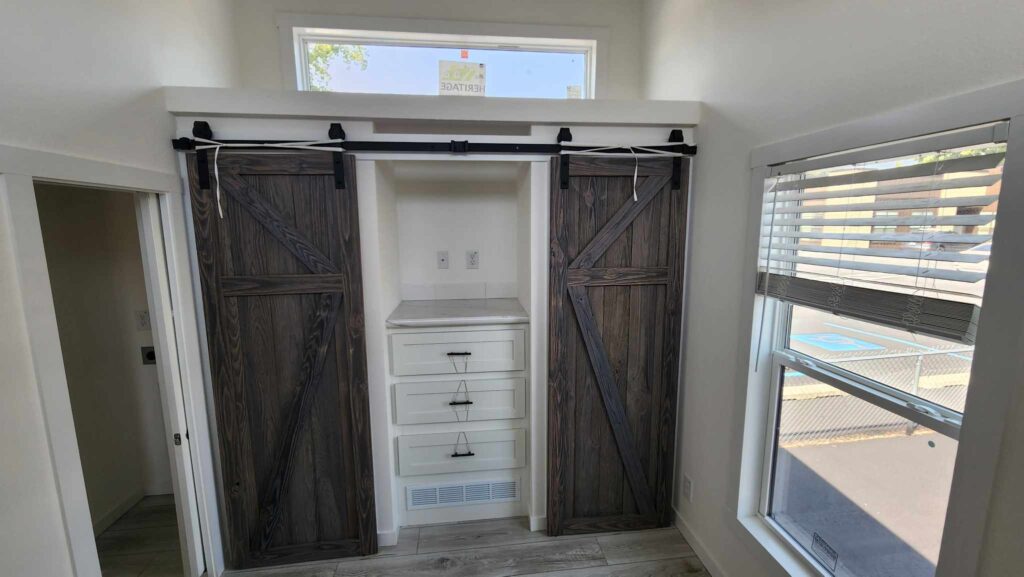 This is a feature you will not find in every tiny house. Of course, the farmhouse sink also gives you plenty of room if you want to hand-wash your dishes.