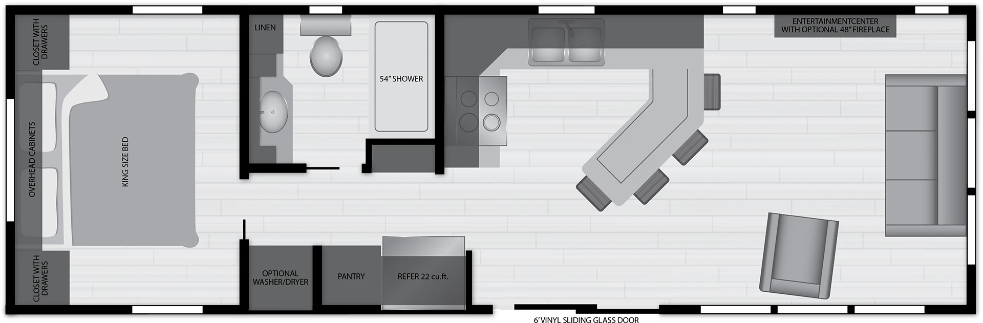 Discover the Kropf Island Series, where 14 thoughtfully designed floor-plans offer the perfect foundation for your personalized park model home. Built with superior craftsmanship, this series provides a wide range of standard features, along with extensive upgrade options to suit your unique needs. Whether you’re seeking specific comforts or enhanced functionality, this home can be customized to fit your lifestyle—ensuring you get exactly what you want without unnecessary extras.