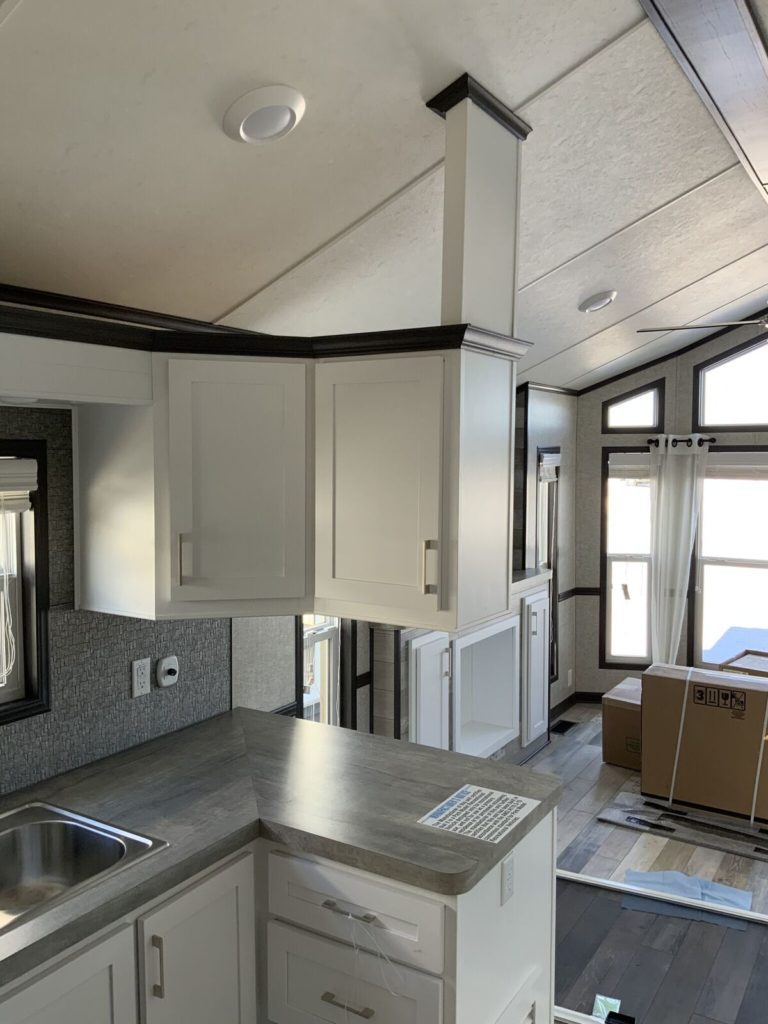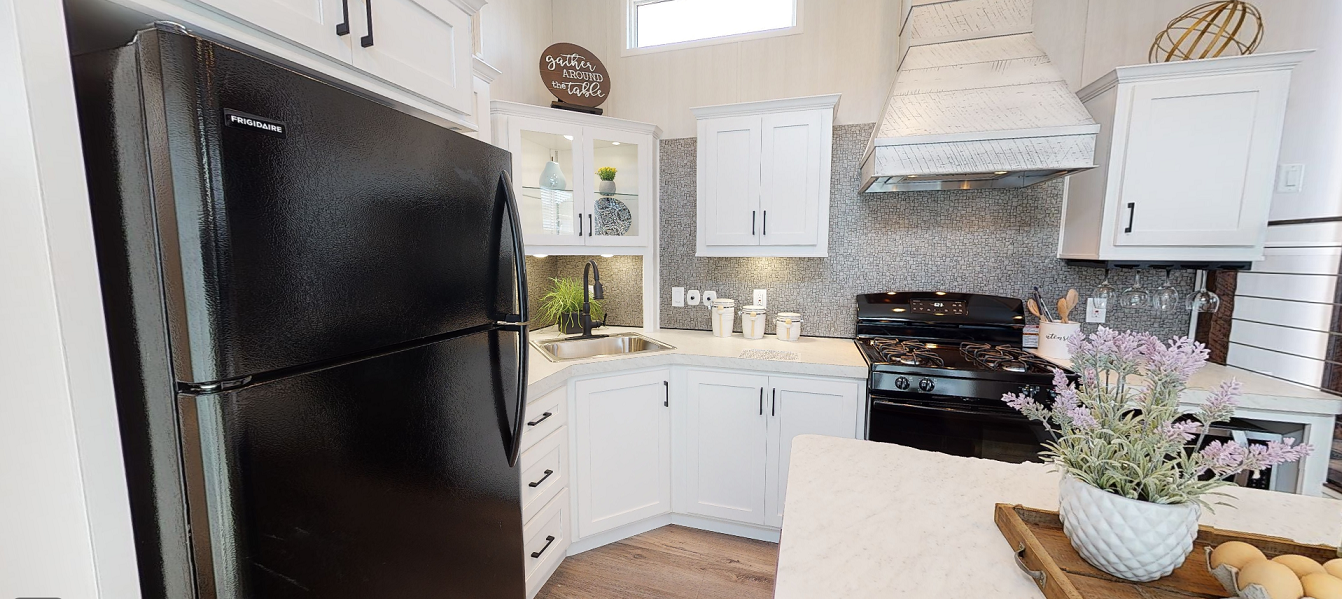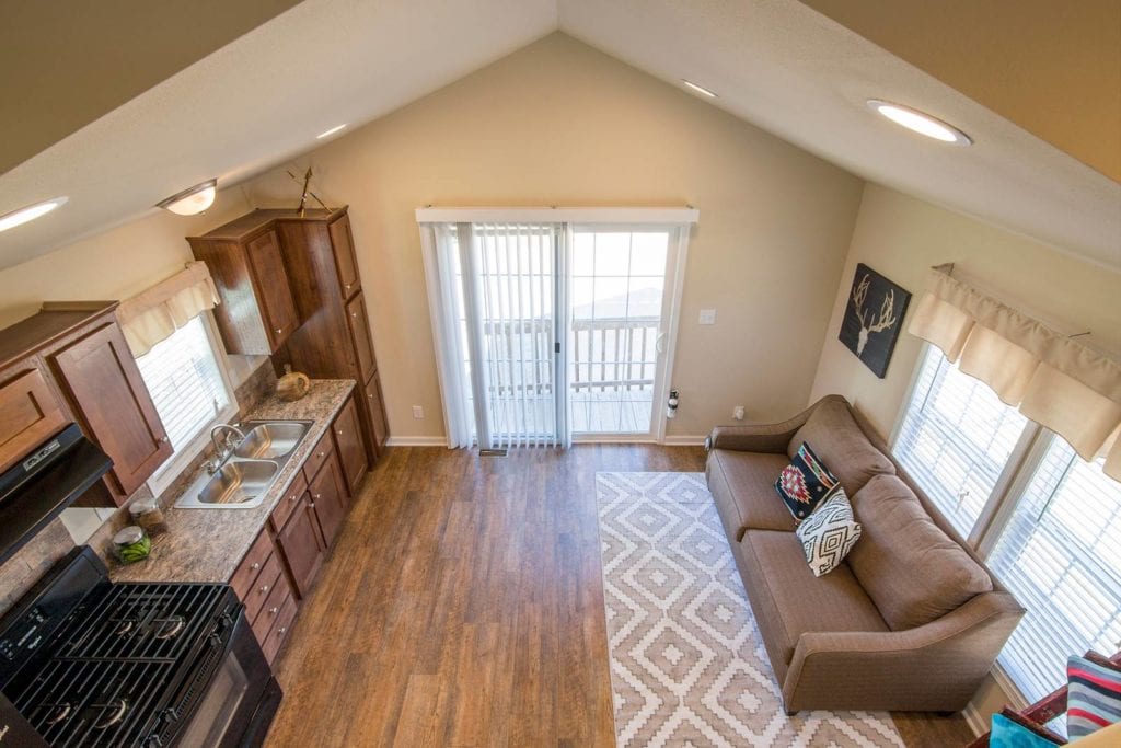 Like quite a few of our park models, the Denali Dunn’s floor plan includes a downstairs bedroom located at the back of the home behind the kitchen.